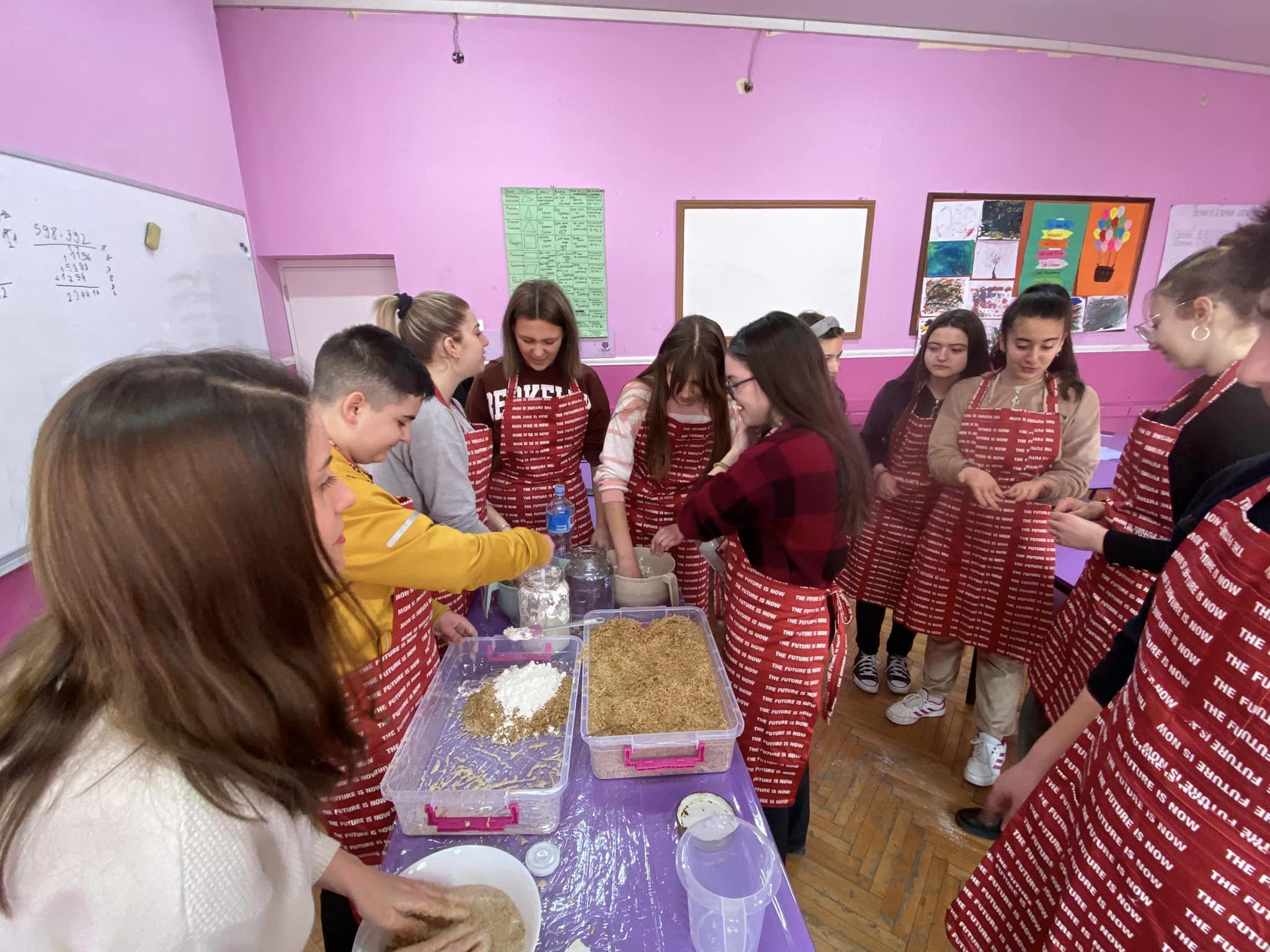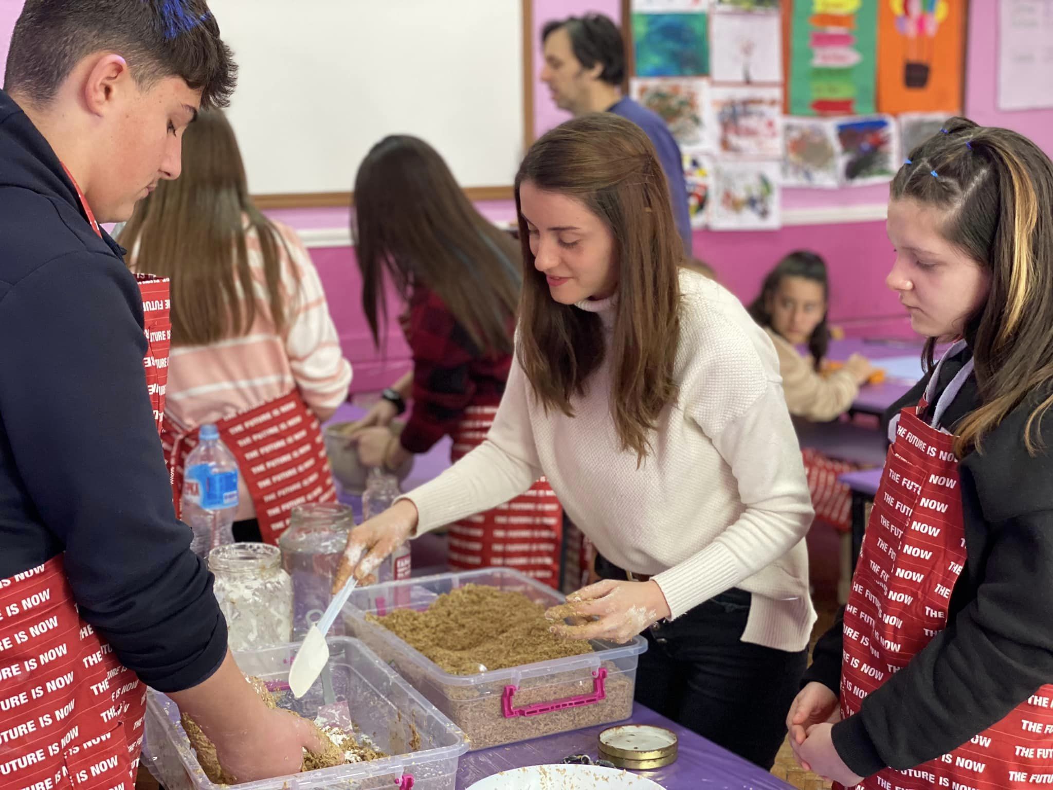 A lecture and workshop under the mentorship of Viktorija Miteva, a member of the Associated Citizens ODONATA, who gave the students from “Malina Popivanova”, a primary school in Kochani, information about critical contemporary artists who work with rice waste, as well as contemporary art practices giving priority to the ecological aspect of creation. The workshop continued with a mixture of rice husk, wheat starch, and water, suitable for making figurines and related/similar to clay in terms of shaping properties, such as: obtaining volume, drying period, and shaping capacity.