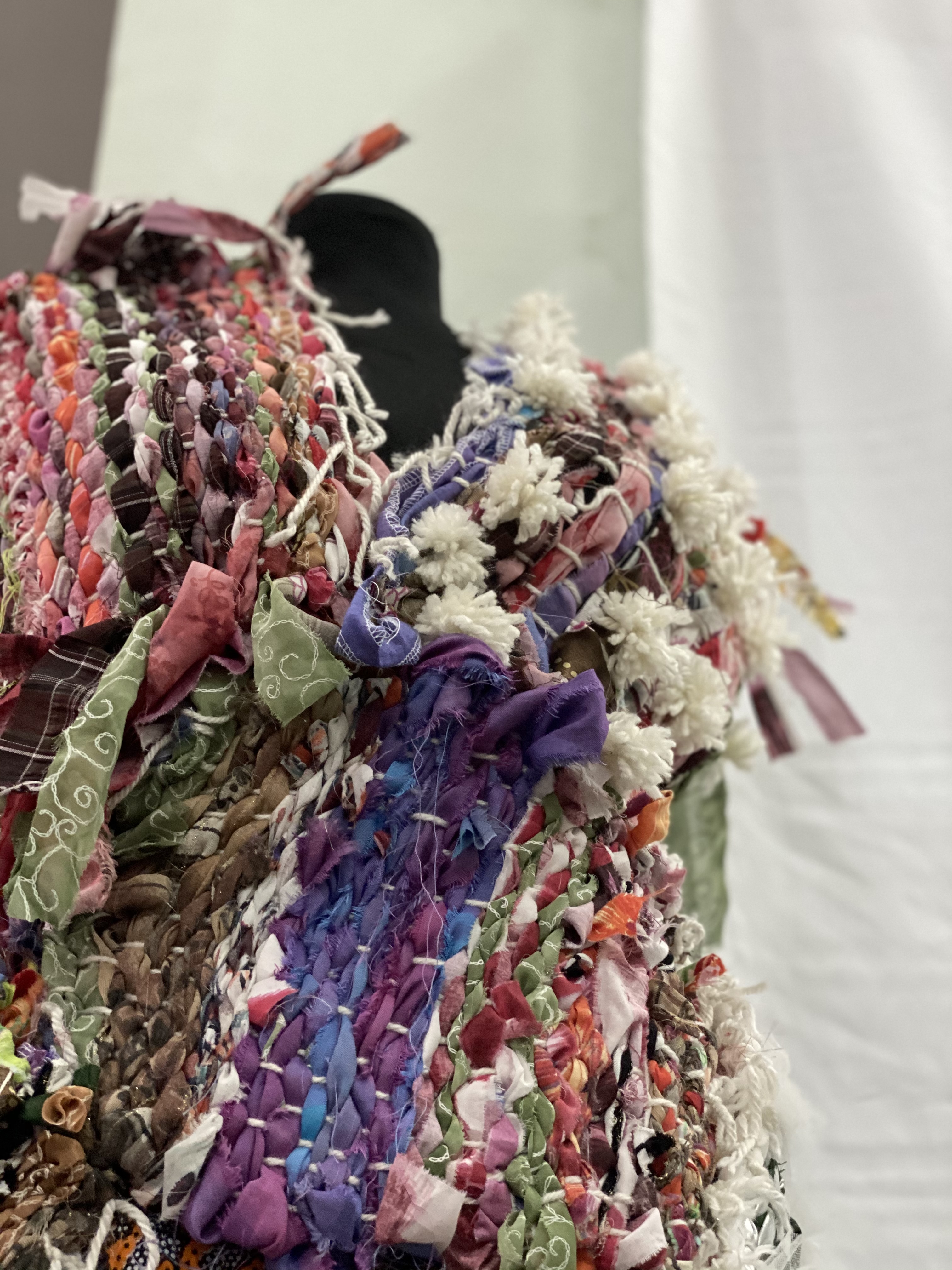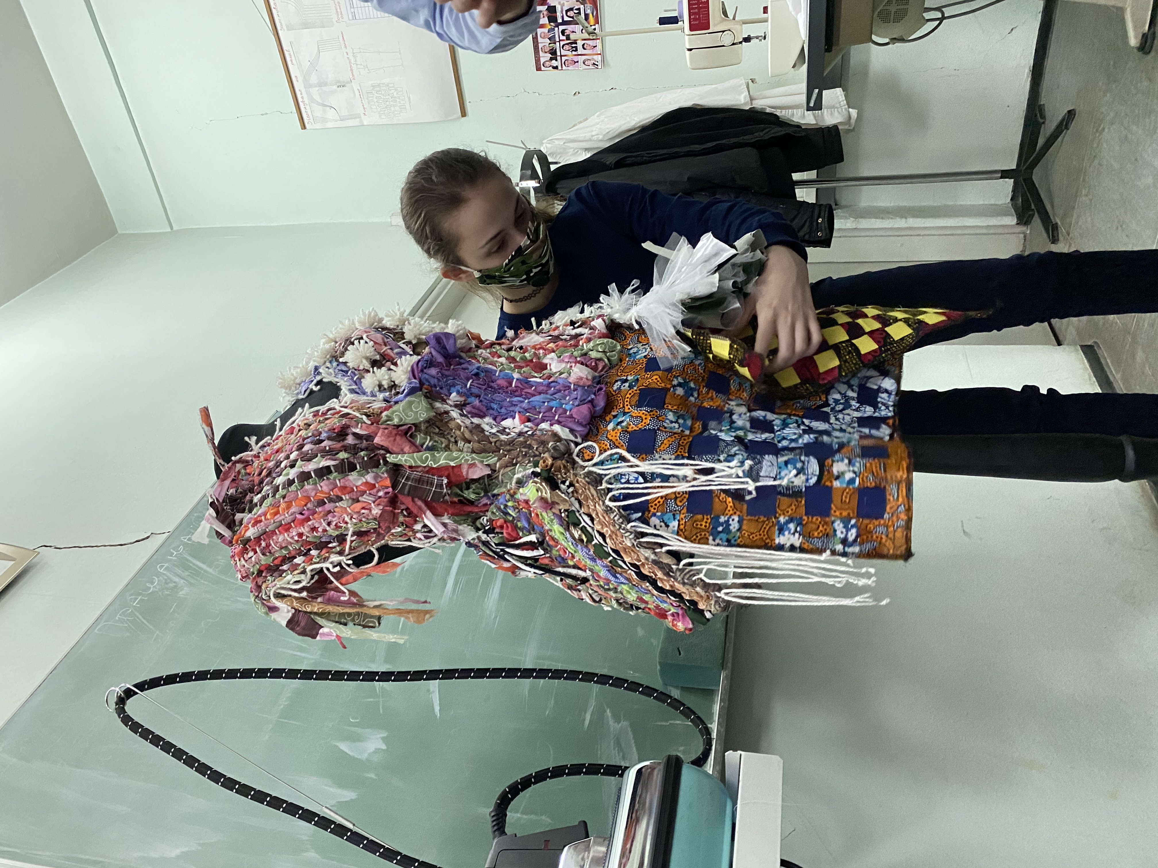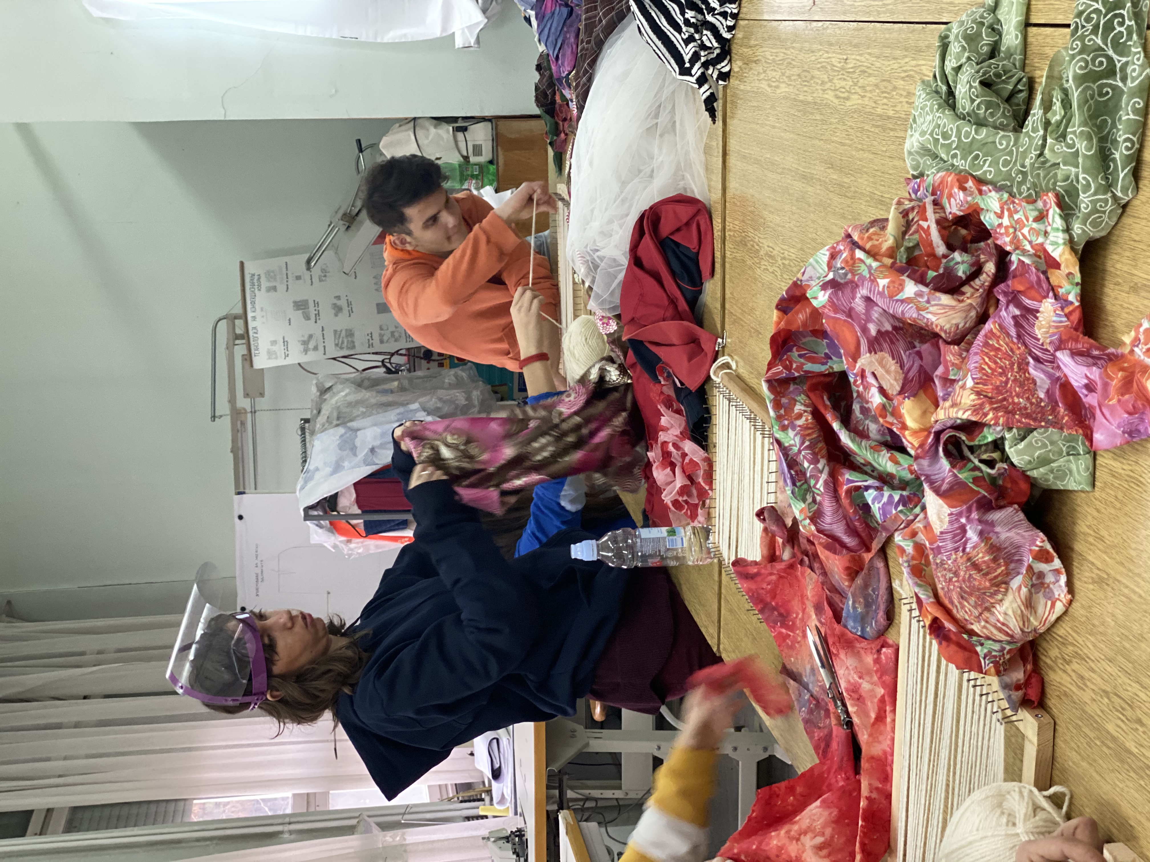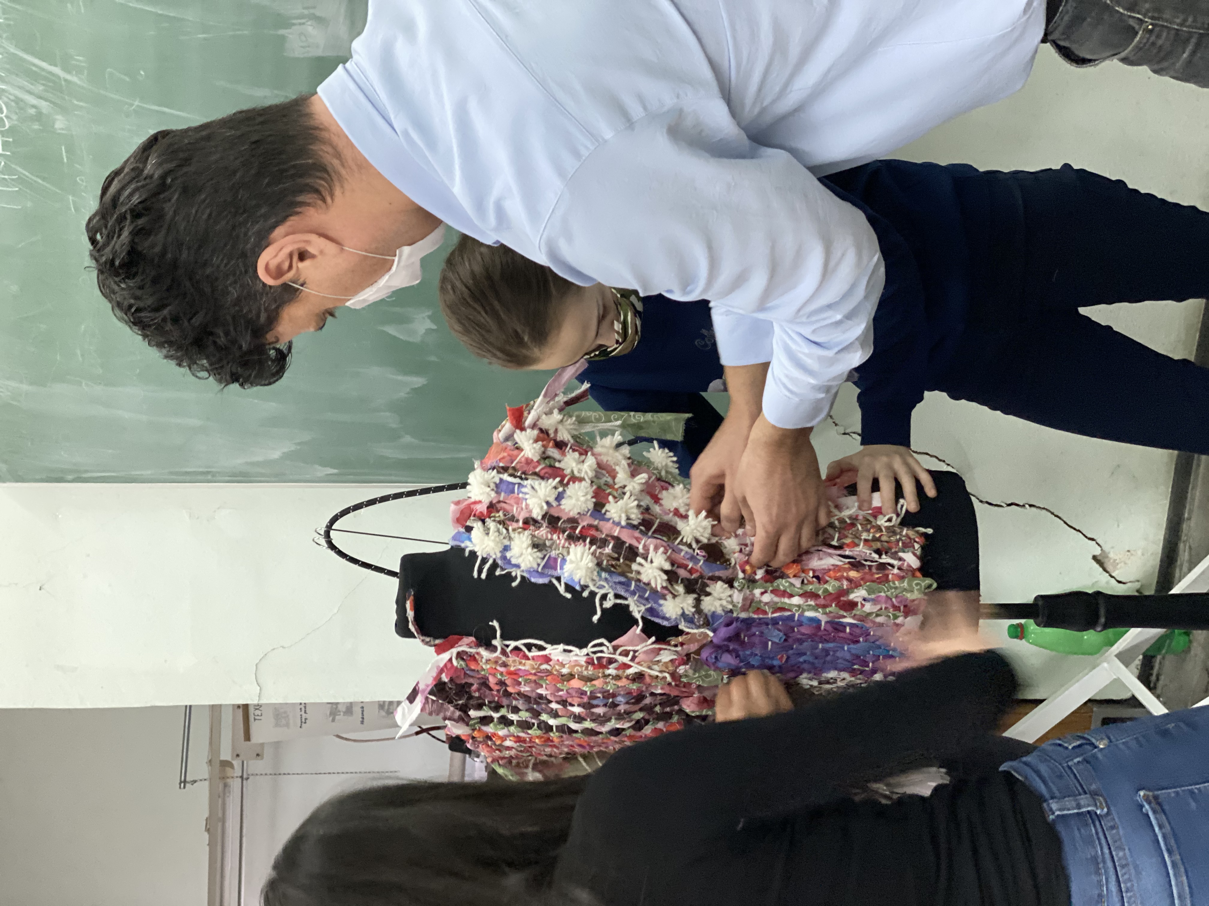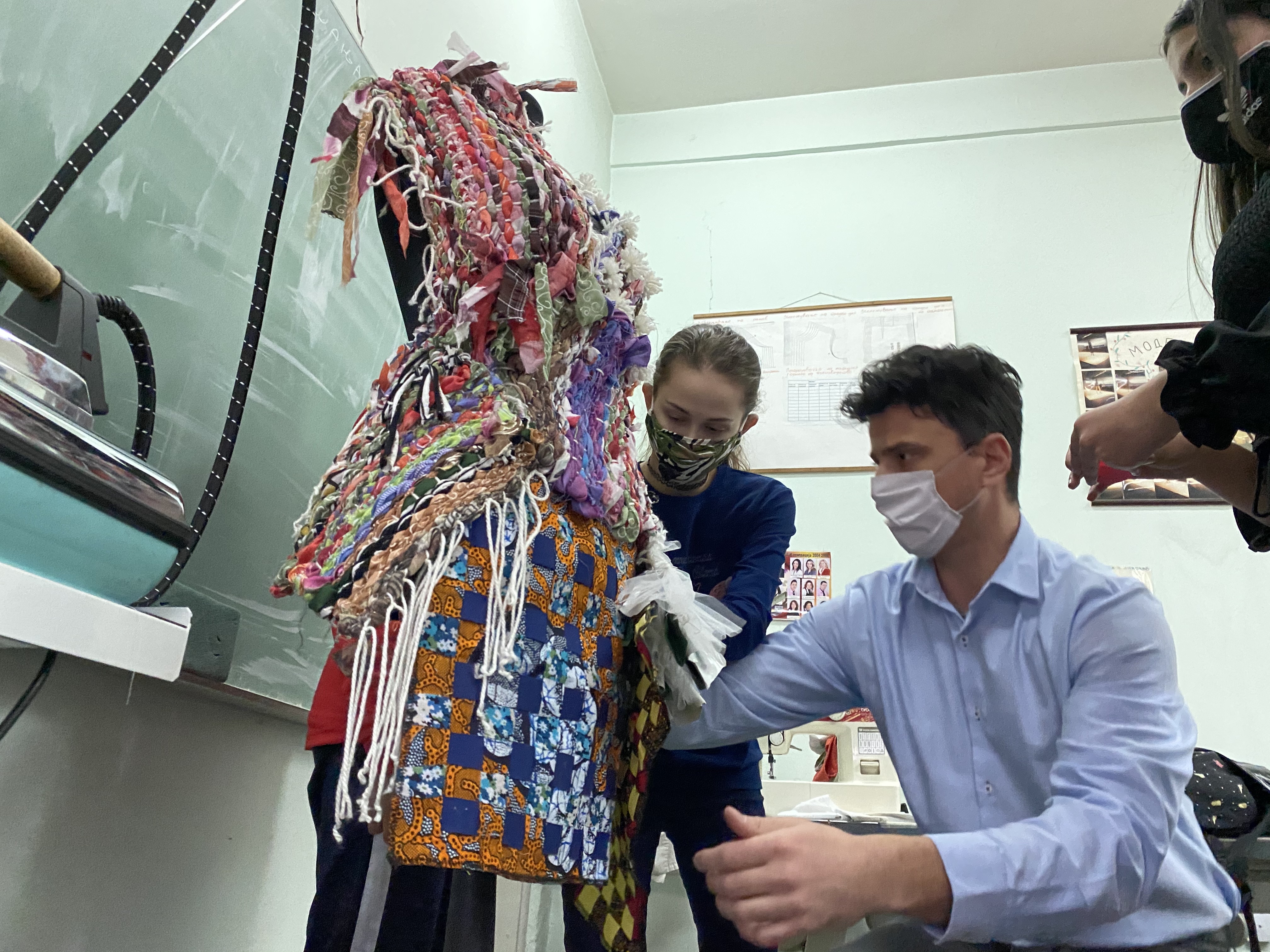 Our next workshopwas dedicated to reviving the ethno elements of traditional costumes and mixing them in a modern way, through sketching of contemporary and imaginative clothings and accessories. We compiled and fitted the single recycled woven patterns, thus completing the first model for their capsule collection with excellent teamwork.