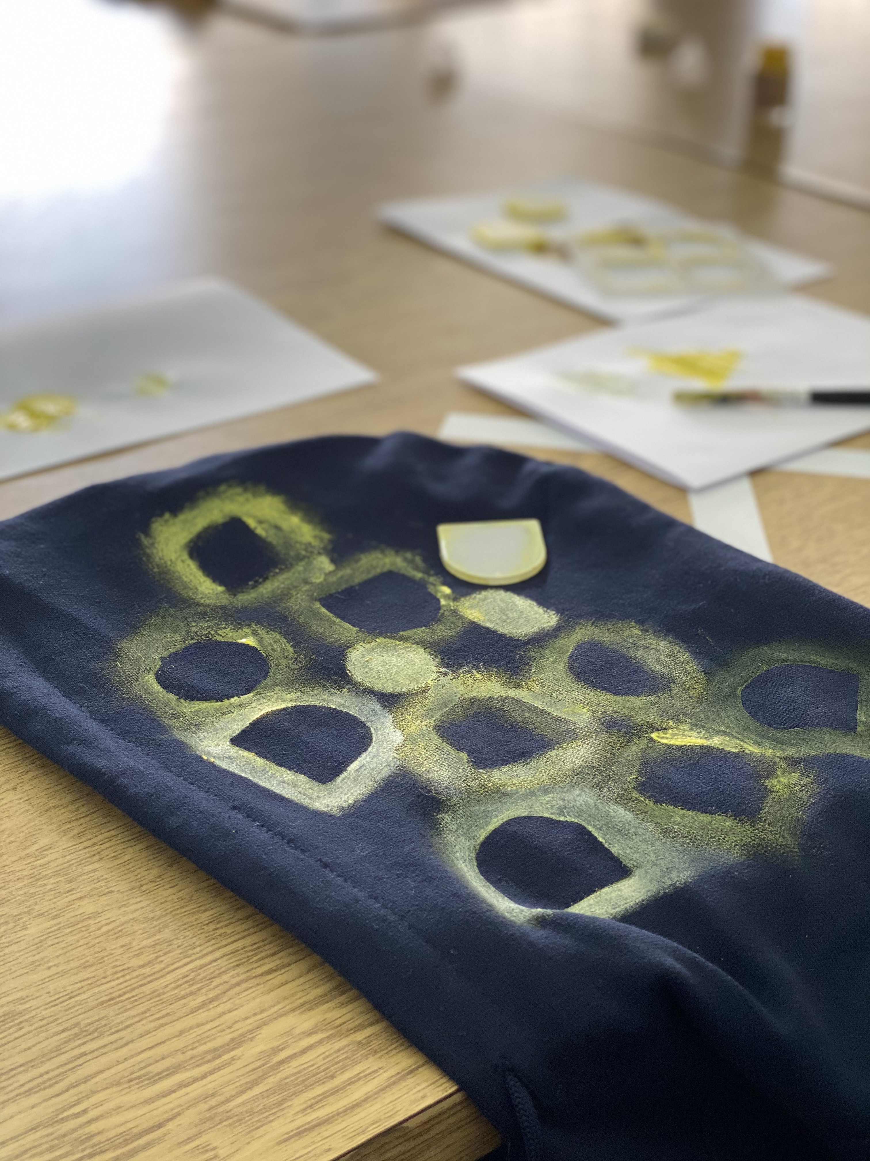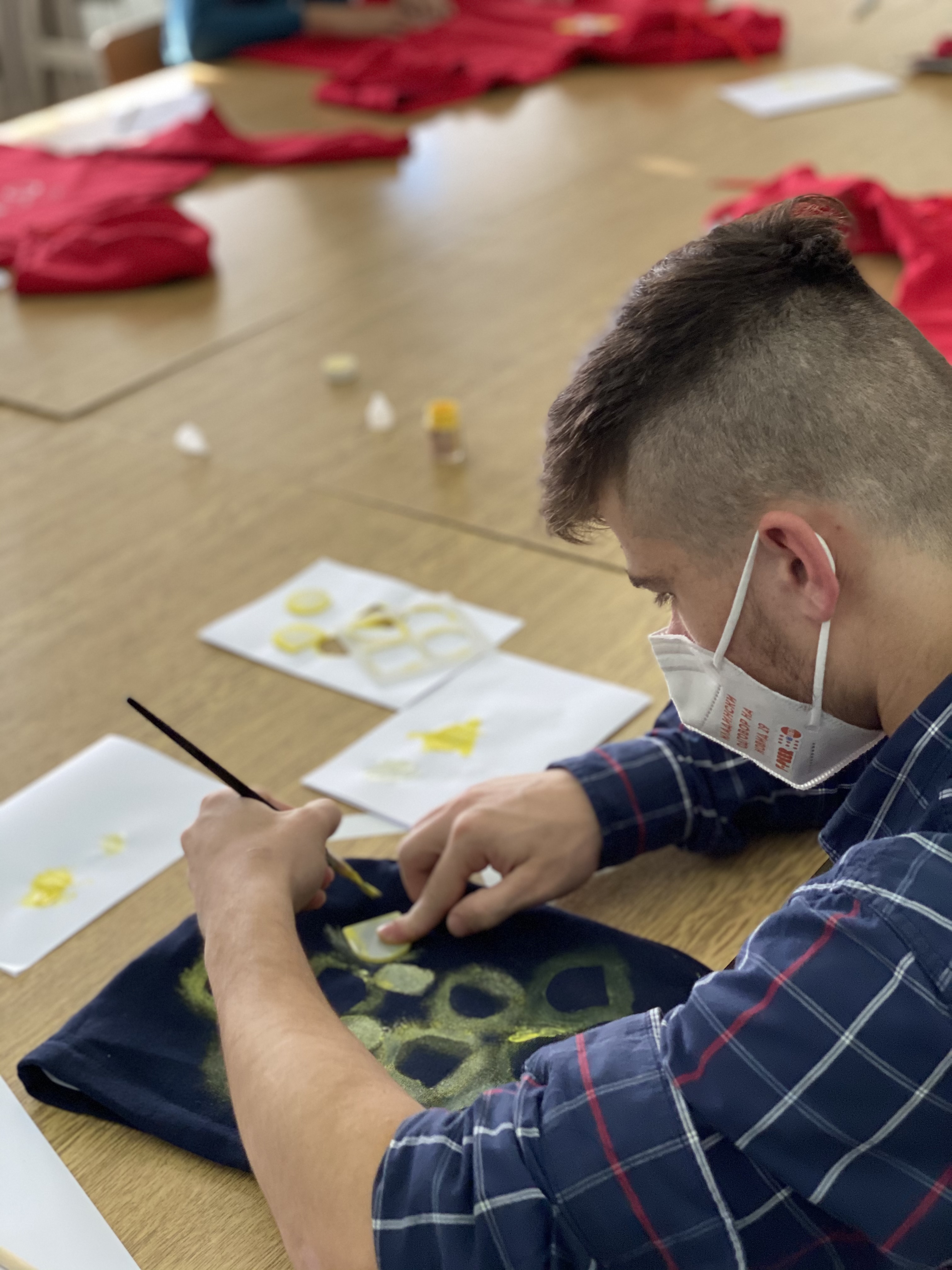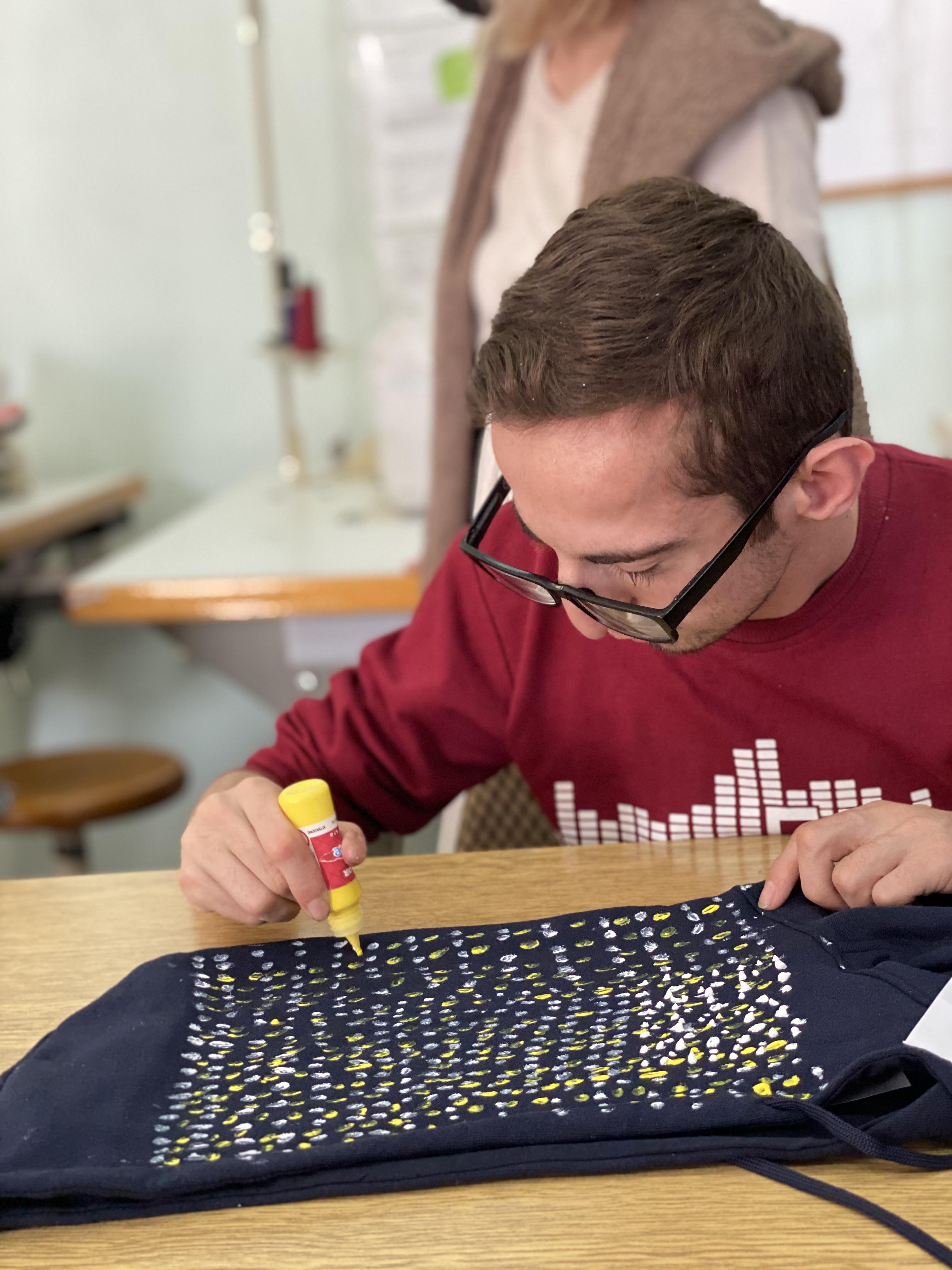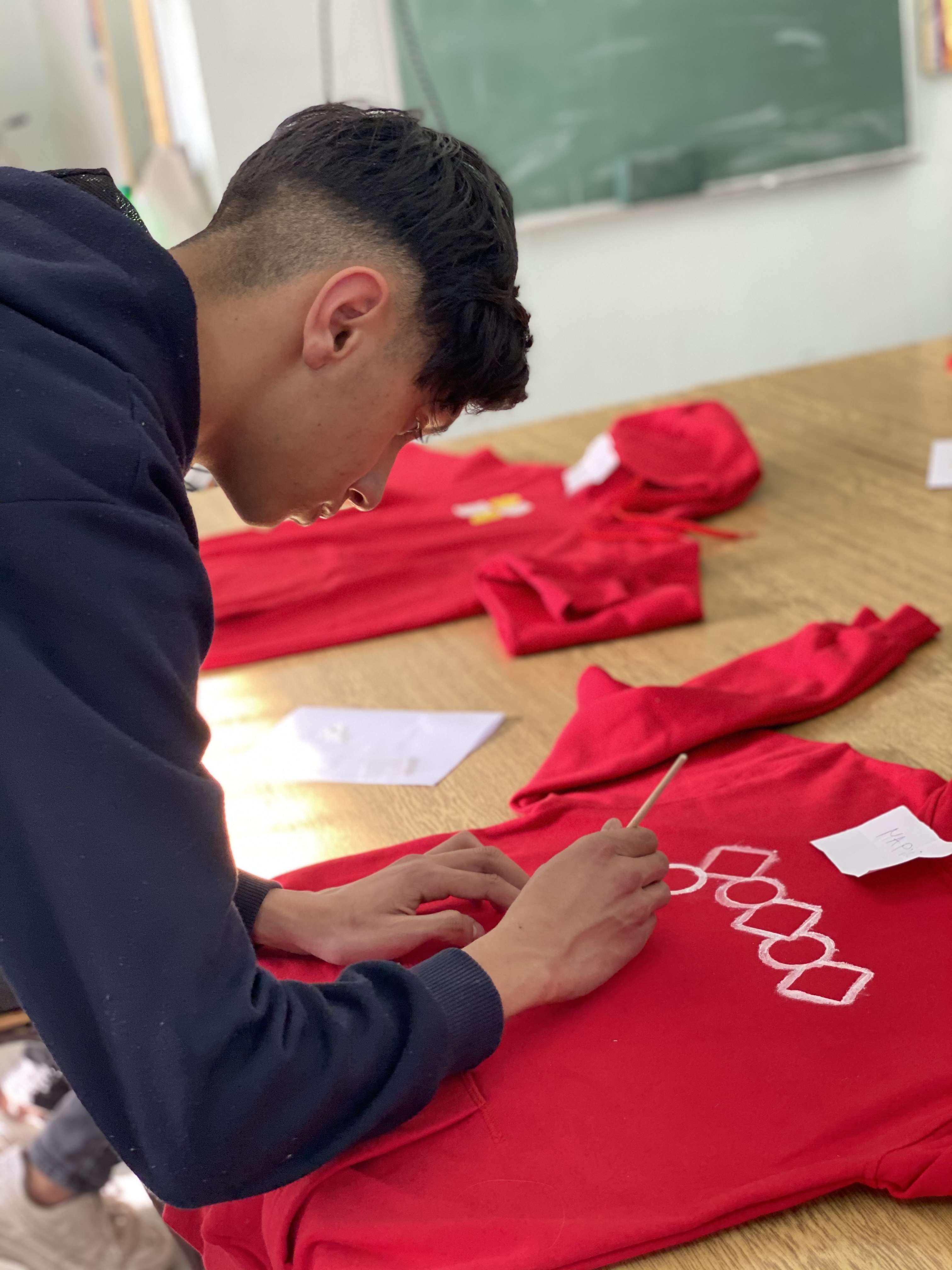 The workshopsbegan with goals setting and a two months action plan for all activities. What followed next was an amusing and exciting task to create school uniforms one for each other. The group of young adults expressed their vivid imagination and unique vision through making prints on cotton hoodies with the project logo as starting inspiration.